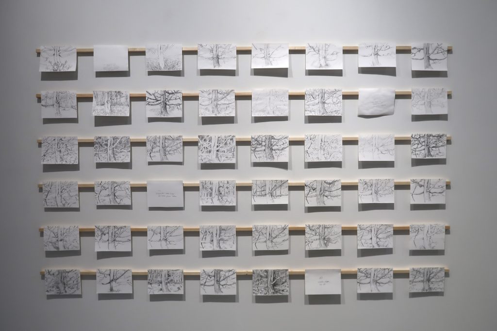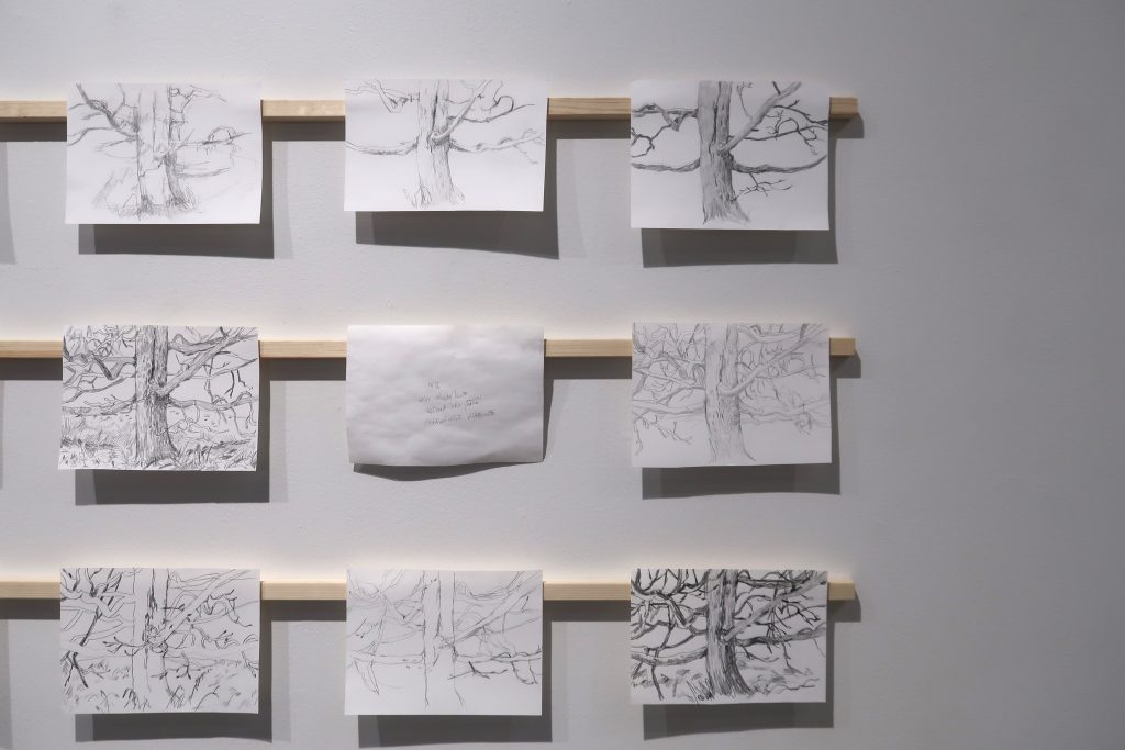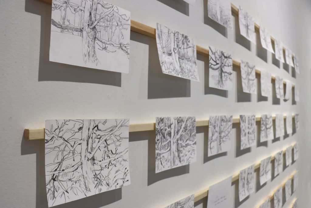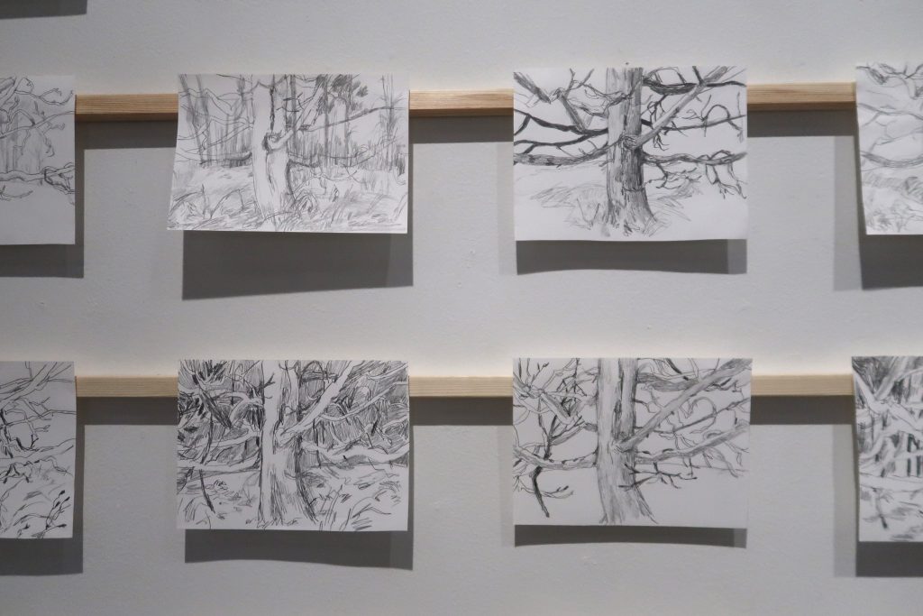 Havainto. Pysähtyminen ja tarkkaan katsominen. Piirtämisen hetki ja paperille välittyvä tunne. Näkymän, muutoksen ja ajan kulumisen dokumentointi.