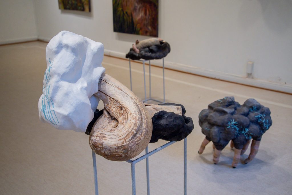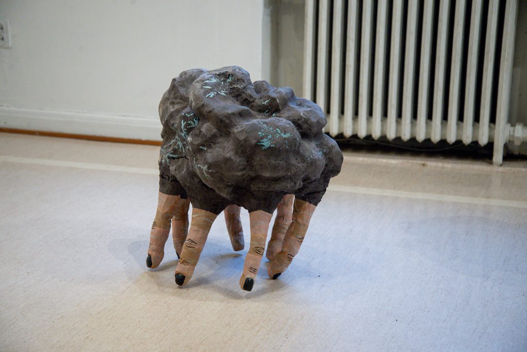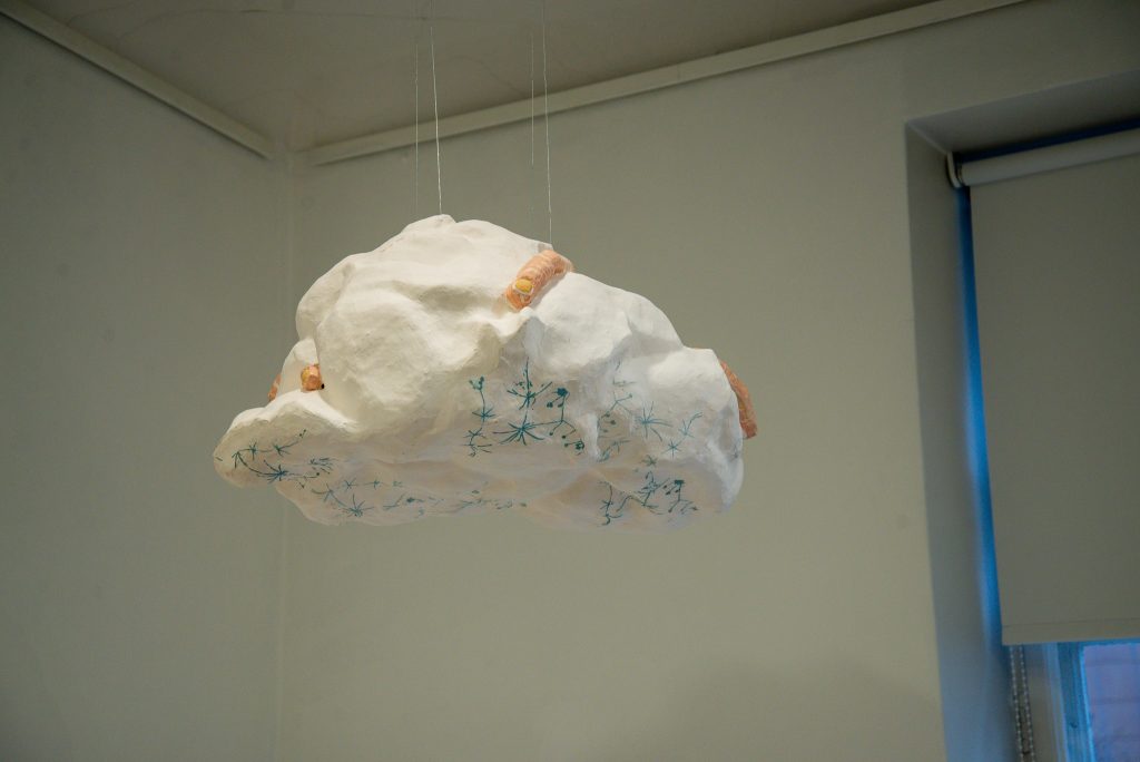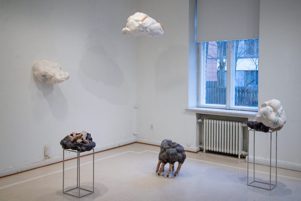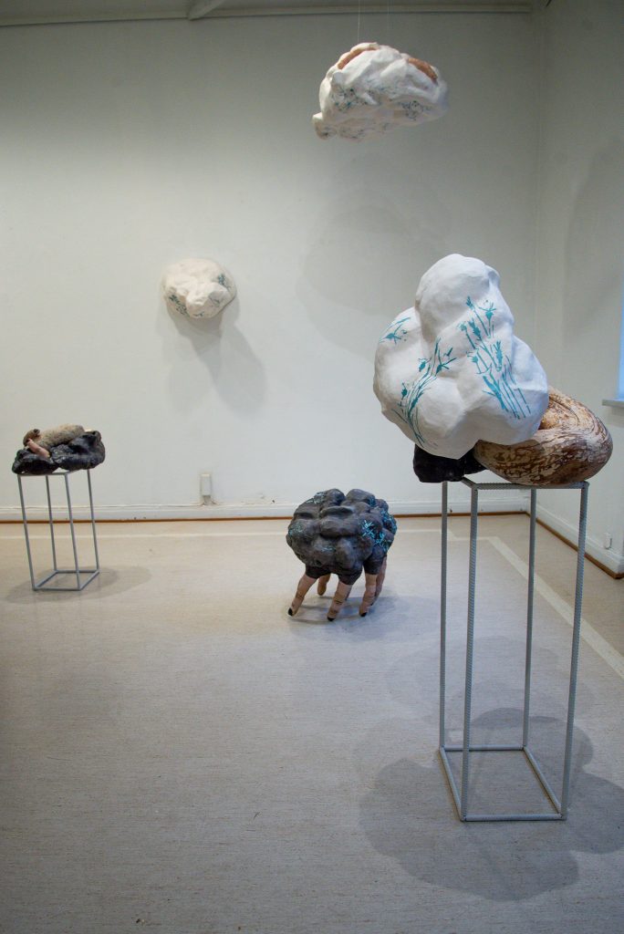 Keraamisten pilvimuotojen, niihin kietoutuneiden ja niistä ulospistävien sormien kautta pohdin puuttumista. Ihminen on mestari sopeutumaan ja muokkaamaan elinympäristöjään. Nyt kuitenkin olemme vaiheessa, jossa meidän pitää reagoida itse aiheuttamaamme kiihtyvään muutokseen. Mikä määrä sormeilua on hyvä ja missä vaiheessa liikaa?